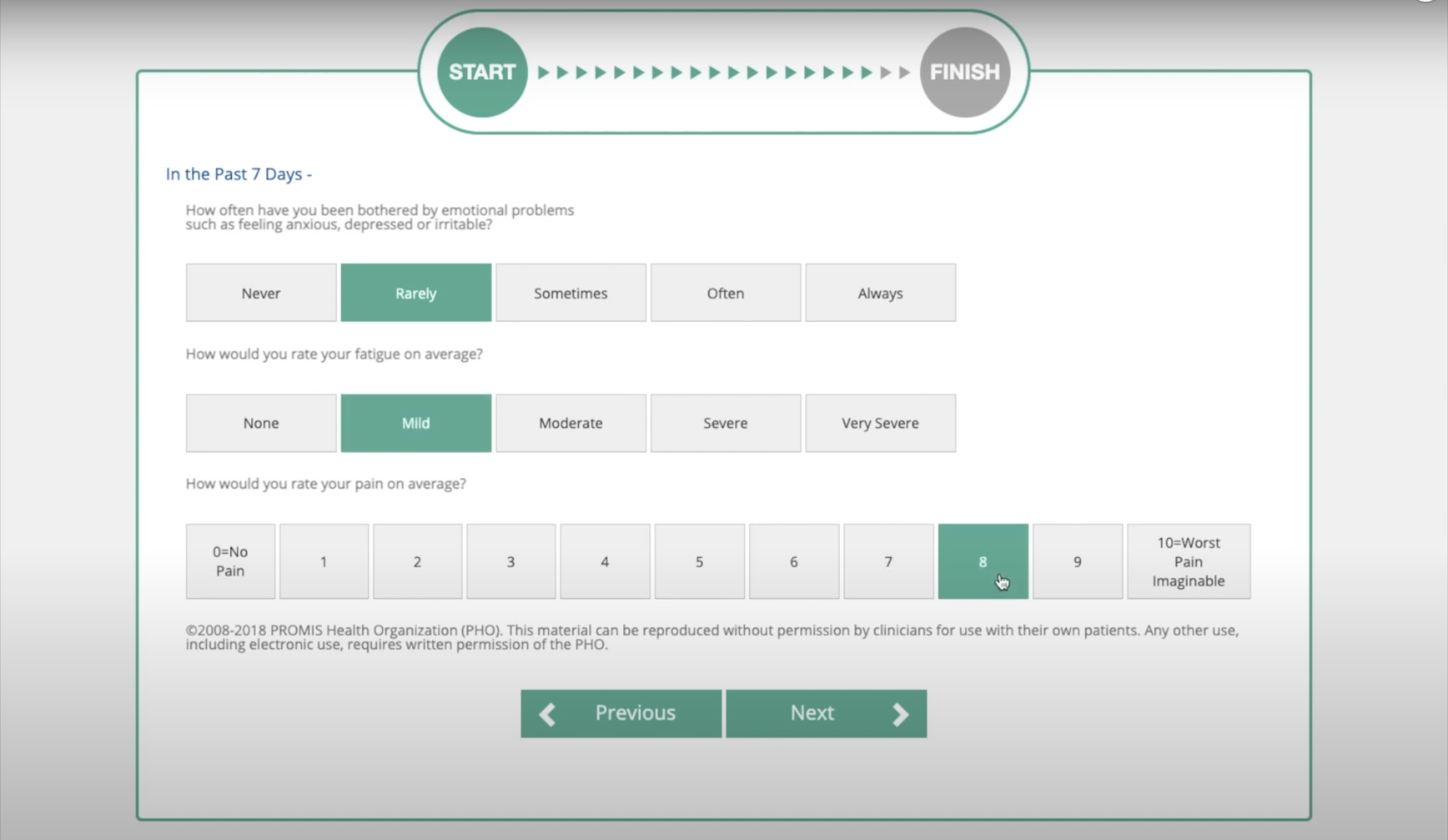 It includes a simple 10 question global health questionnaire which tracks overall physical and mental health, including wellbeing, energy levels and also includes a 0-10 pain scale.
